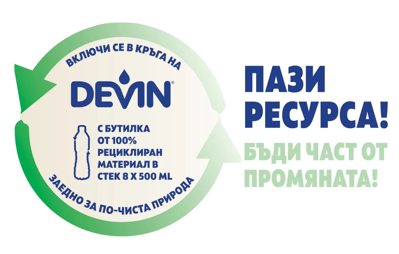 Още през 2024 г. от DEVIN Минерална произвеждат първият стек от осем 500-милилитрови бутилки от 100% рециклирани бутилки, но ако тези бутилки на свой ред не се изхвърлят разделно от потребителите и попаднат в природата – се намалява ефектът от този процес. И тук идва ролята на всеки един човек. Без активното участие на крайните потребители в разделното събиране, процентът на събраните опаковки, годни за рециклиране, не би могъл да обезпечи нуждите на екологично насочените производства. Затова – “Включи се в кръга на DEVIN – заедно за по-чиста природа!”